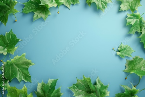 Flat lay frame with colorful green leaves on the blue background with ample copy space image. isolated pastel backdrop. colorful desktop wallpaper with maple leaves