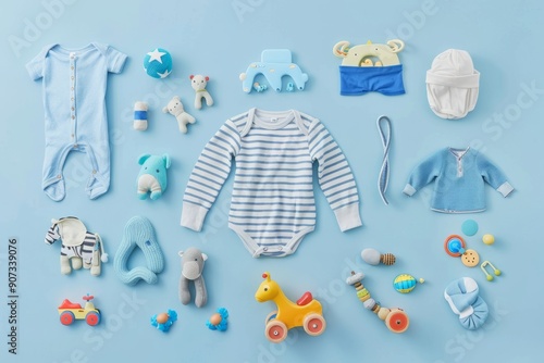 Flat lay image of baby boy clothes complete with baby boy toys, light blue background , baby stuff , baby clothing