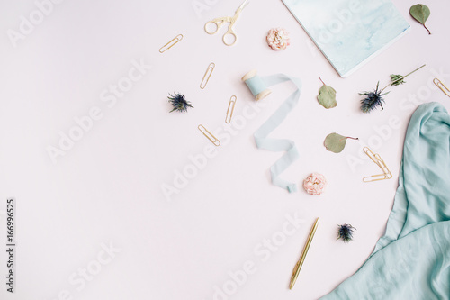 accessory, background, blank, blog, bright, bud, business, clipboard, desk, dry, essential, eucalyptus, feminine, flat, floral, flower, freelance, home, lay, leaf, lifestyle, minimal, neutral, pale, paper, pattern, pink, rose, scissors, space, style, table, text, texture, top, view, woman, workspace, textile, blue, ribbon