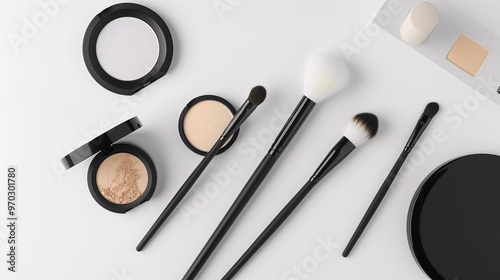 Flat lay of elegant makeup brushes and compact powders on a white background, ultra-sharp photograph