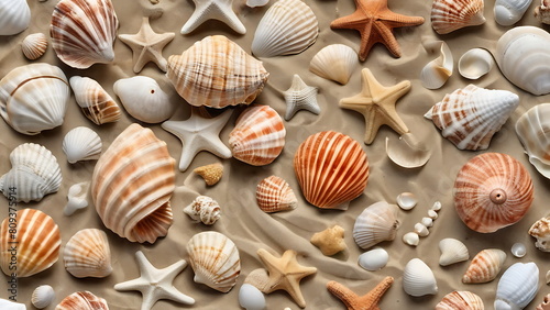 Flat lay of exotic starfish and sea shells on beach sand