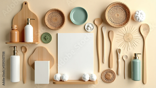 Flat lay of natural household and personal care items: soap, wood, and cotton balls on a cream background. Clean, natural, minimalist concept.
