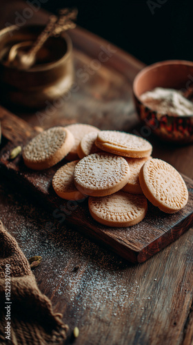 Flat lay of orange cardamom cookies, shaped into delicate rounds and placed on a rustic wooden board