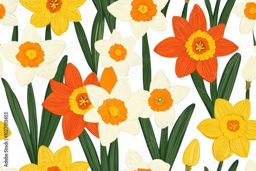 daffodil, flat, style, seamless, pattern, isolate, white, background, flower, unique, design, repeating, colourful, artistic, vibrant, fun, cheerful, floral