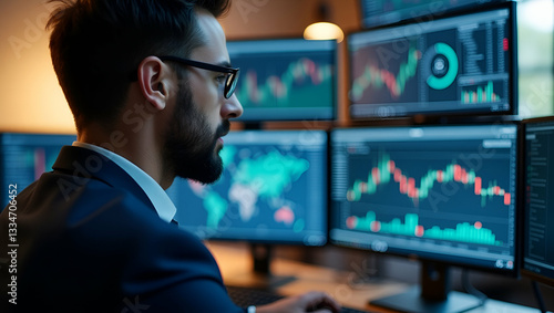 Flat Successful trader with back view bearded stock market broker in eyeglasses analyzing data and graphs on multiple computer screens in modern office. concept as Successful trader with back view bea