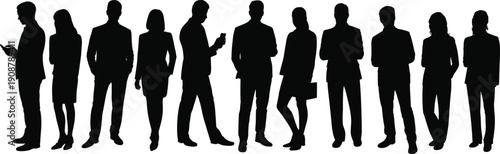 Flat vector illustration of diverse business professionals silhouettes standing in row symbolizing teamwork, corporate culture, leadership, office environment, collaboration, success