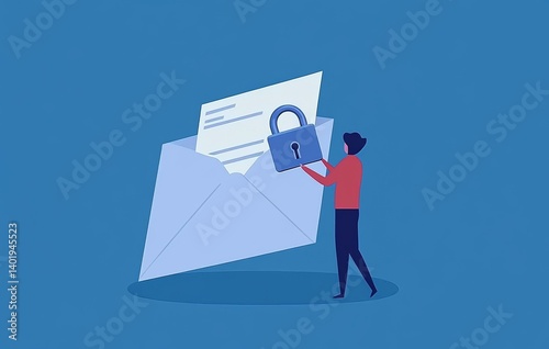 Flat Vector Illustration of Person Holding Lock in Front of Open Letter-Shaped Document with Keyhole, Symbolizing Cyber Security and Data Protection on Blue Background