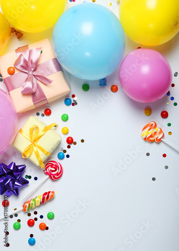 arranged, assortment, background, balloon, birthday, birthday party, blue, border, bow, box, candle, candy, cap, card, carnival, celebration, children, colourful, conceptual, confetti, copy space, decor, decoration, event, festival, festive, frame, from above, fun, gift, gift box, gold, hat, holiday, children, object, overhead, party, present, ribbon, serpentine, star, streamer, topview