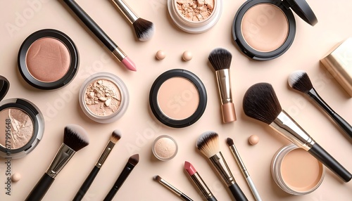 Flatlay of Luxury Makeup Brushes and Cosmetics on Beige Background: A Stylish Arrangement of Powder, Lipstick, and Tools