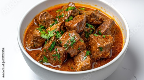 Flavorful Indian Style Beef Curry Stew in Bowl with Fresh Herbs and Spices