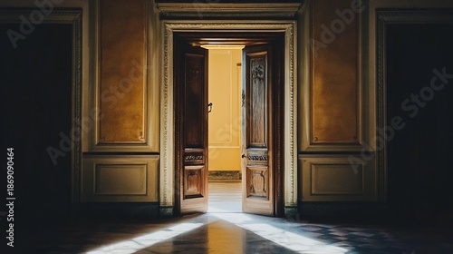 flawlessness. A heavy wooden door opens to a bright corridor with dramatic side lighting. real-estate listings, architecture portfolios, designed for interior renovation comparisons for interiors.