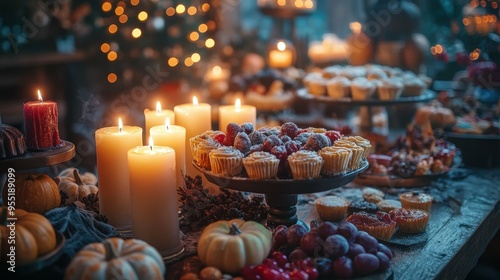 Flickering candles casting a warm, amber glow on a table of Halloween-themed sweets and treats