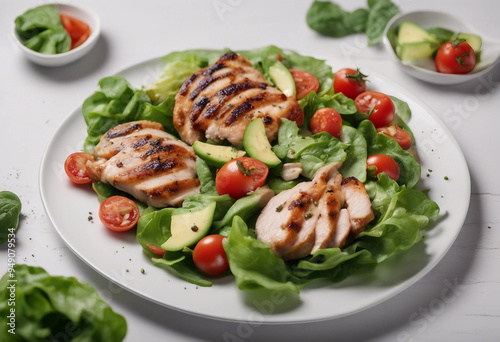 Floated Grilled chicken meat and fresh vegetable salad of tomato avocado lettuce and spinach falling