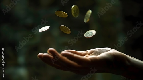 Floating Coins Above Hand: Coins floating above an outstretched hand, captured mid-air with motion blur and a rich, dark background.