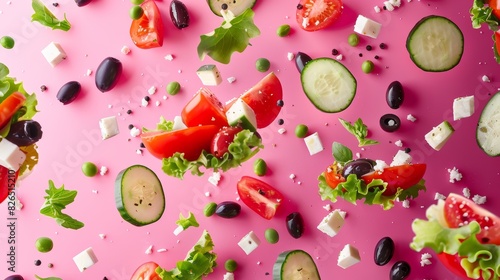 greek, salad, ingredient, advertising, banner, high contrast, cucumber, tomatoes, black olive, feta, floating, artistic, diced, crumbled, fresh, vibrant, colourful, bold, layout, design, healthy, diet, nourishment, vegetarian, vegetable, feta, mediterranean, cookery, appetising, eye-catching, pink, arrangement, epicure, marketing, receipe, bright, delicious, aesthetic