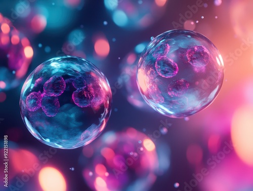 Floating human cells in a neonlit lab environment, each showing different stages of genetic modification, futuristic and clean design, genetic research, cellular cloning