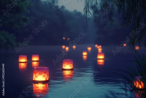 Floating lanterns illuminate a serene riverside during a tranquil evening