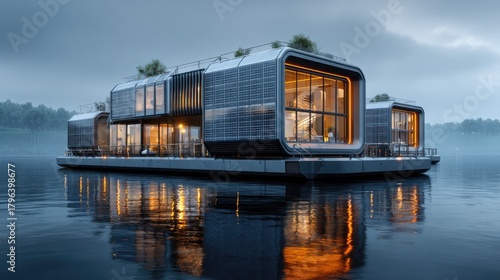 Floating Modern Abode: A sleek, modern house gracefully floats upon tranquil waters, its contemporary design reflecting the serenity of the surrounding landscape.