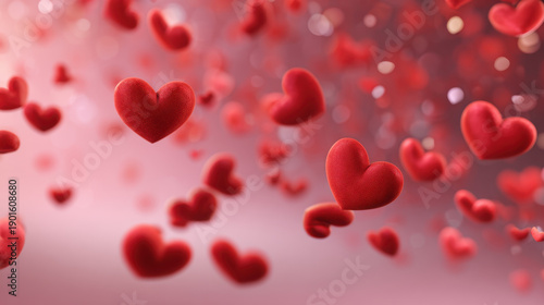Floating red hearts create romantic atmosphere against soft pink background, evoking feelings of love and joy. This vibrant scene captures essence of affection and celebration