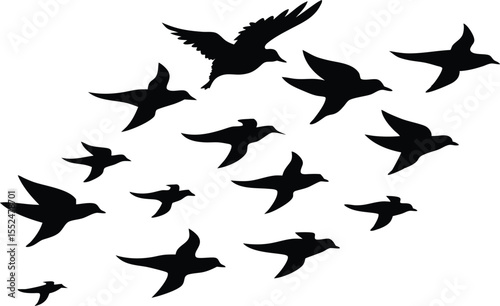 Flock of flying birds silhouette, Flying birds silhouettes on white background