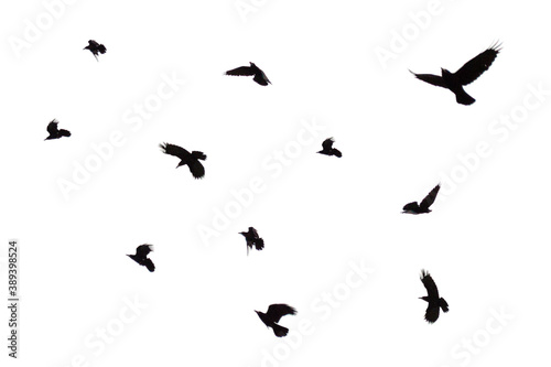 Flock of flying crows isolated on white background. Flock of birds isolated on white. Black crows are isolated in flight.