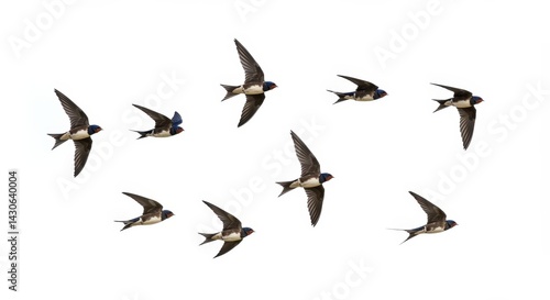 Flock of Swallows In Flight Against Clear White Sky. AI generatif