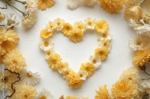 Floral arrangement featuring a heart shape crafted from assorted yellow blossoms on a white backdrop. Concepts of Easter, spring, and summer. Overhead perspective, flat lay.