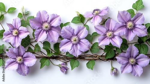 Floral arrangement with purple clematis blossoms and lush green foliage arranged horizontally across a white background.