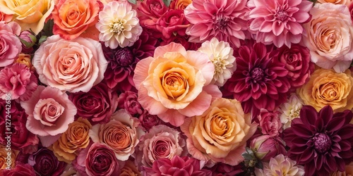 Floral Background: Dense Arrangement of Roses and Dahlias in Shades of Pink, Orange, Red, and White, Creating a Vivid and Colorful Pattern with Lush Petals and a Rich, Textured Appearance
