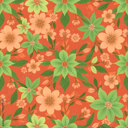 Floral Burst: A vibrant, seamless pattern featuring a cascade of delicate peach and green flowers against a warm red background.