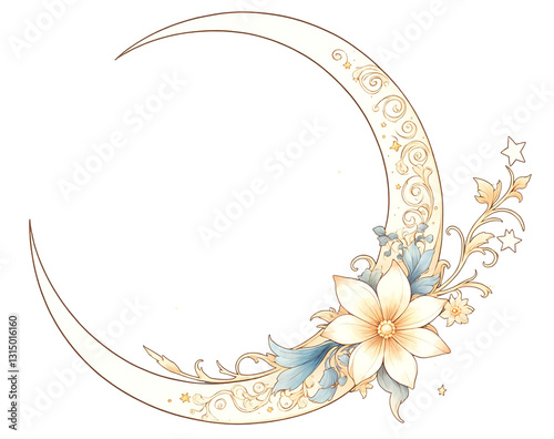 moon, crescent moon, floral, decorative, fantasy, illustration, art, design, starry, celestial, elegant, intricate, ornate, vintage, romantic, dreamy, whimsical
