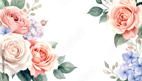 Floral Elegance: Delicate watercolor roses and hydrangea blooms create a romantic and soft composition, perfect for design or background.
