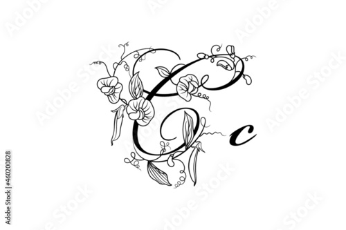 Floral font. Letter C with sweet pea flowers. Wonderful flora letter for unique spring or summer design. Tattoo. Isolated.