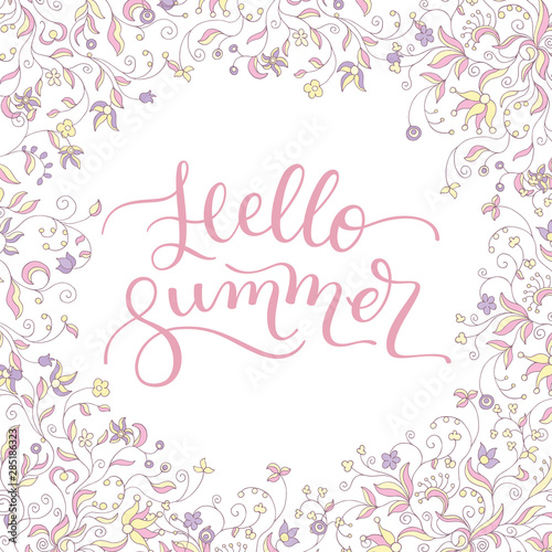 Floral frame and hand lettering Hello Summer. Template for greeting cards, posters, print.