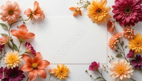 flower, arranging, blooming, daisy, gerbera, blossom, floral, leaf, white, background, card, greeting, spring, summer, frame, border, blank, space, invitation, orange, yellow, pink, red, burgundy, colourful, bright, nature, floral arrangement, topview, template, design element, decoration, celebration, holiday, event, minimal, copy space