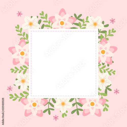 Floral greeting card and invitation template for wedding or birthday anniversary, Vector shape of text box label and frame, Pink flowers wreath ivy style with branch and leaves.