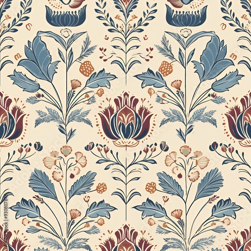 Floral pattern featuring intricate botanical designs in blue, red, and beige.