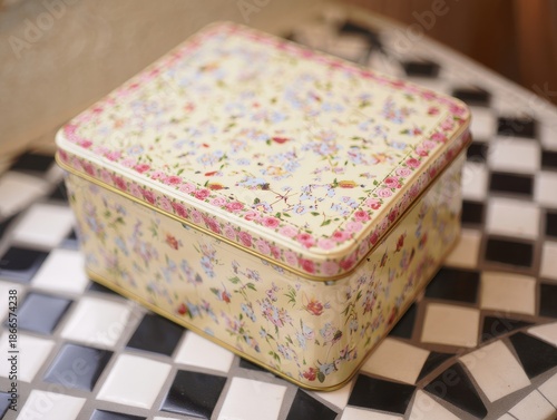 floral, flower, pastel, storage, container, vintage, retro, square, patterned, design, decorative, rose, aesthetic, gift, present, keepsake, home decor, tea, biscuit, cookie, delicate, pretty, romantic, spring, summer, feminine, elegant, charming, ornate, detailed, lid, metal, kitchen, pantry, craft, box, cardboard box, floral pattern, floral pattern, garden, blossom