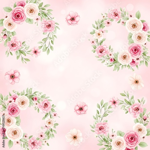 Floral Wreath Background with Pink Roses and Green Leaves.