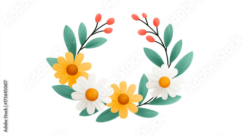 floral, chaplet, daisy, berry, background, flower, nature, botanical, leaf, arrangement, design, green, yellow, white, orange, decorative, blossom, spring, summer, plant, foliage, flower petals, garden, natural, seasonal, elegance, art, creativity, beauty, vibrant, ornament, flora, lush, organic, peaceful, soothing, fresh, serene, bloom, greenery, minimalistic, bright, delicate, accent