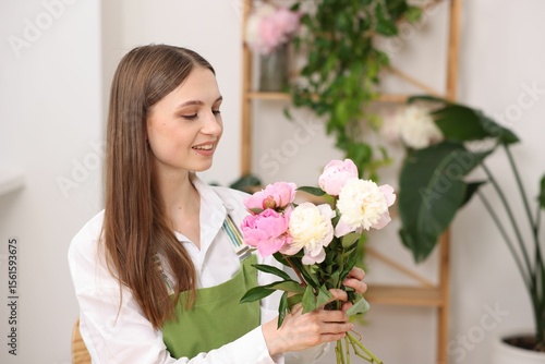 Florist with bouquet of peonies in flower shop