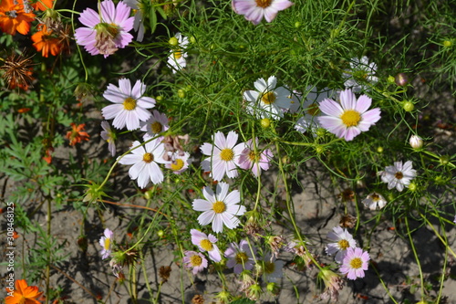 Flower bed, beautiful gentle plants. Homemade plant, gardening. Cosmos, a genus of annual and perennial herbaceous plants of the family Asteraceae. Sunny. White flowers