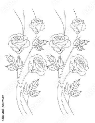 Flower coloring, Hand drawn coloring page for kids and adults. Potted plant, roses. Beautiful drawing with patterns and small details. Coloring book pictures. Vector. Flower coloring page