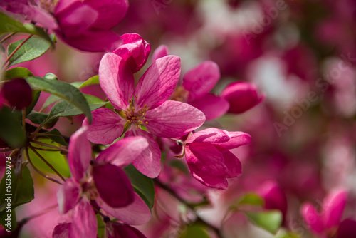 Flowering branches of paradise apple tree. Fruit tree. Photo of nature.