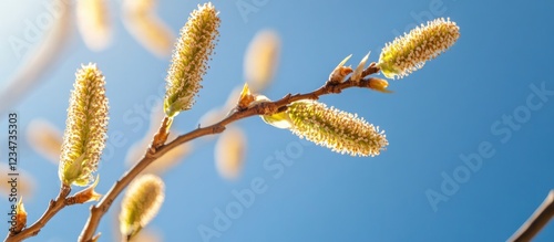 Flowering buds on a branch against a clear blue sky with sunlight Copy Space