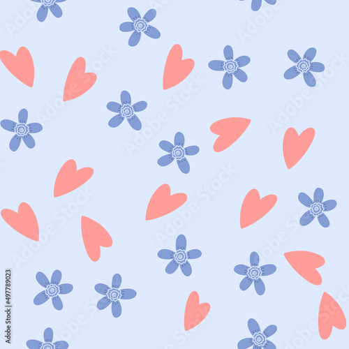 Flowers, heart and leaf seamless pattern. Scandinavian style background. Vector illustration for fabric design, gift paper, baby clothes, textiles, cards.