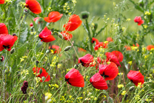 Flowers Red poppies blossom on wild field. Beautiful field red poppies with selective focus. Red poppies in soft light. Opium poppy. Natural drugs. Glade of red poppies. Lonely poppy. Soft focus blur