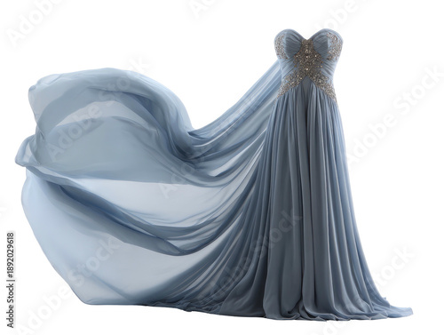 dress, gown, blue, flowing, chiffon, elegant, fashion, attire, formal, garment, fabric, texture, silk, satin, evening, wear, strapless, bodice, embellishment, bead, sequin, light, airy, romantic, aethereal, fantasy, dream, fairy tale, beautiful, stunning, gorgeous, luxury, style, design, sewing, glamour, graceful, studio, isolated, object, beauty, floaty, movement, curve, drape, gathering, soft, whisper