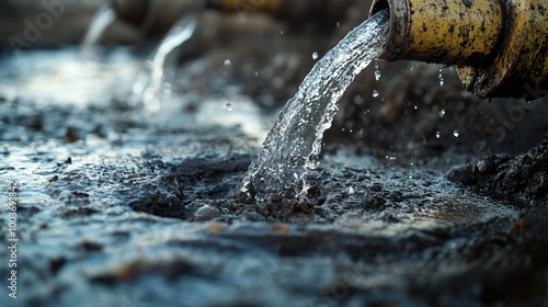 Flowing water from a pipe into muddy ground, creating ripples and splashes.