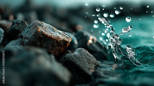 Flowing water splashing over dark rocks creating bubbles in a turquoise backdrop